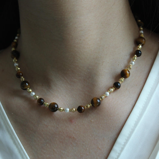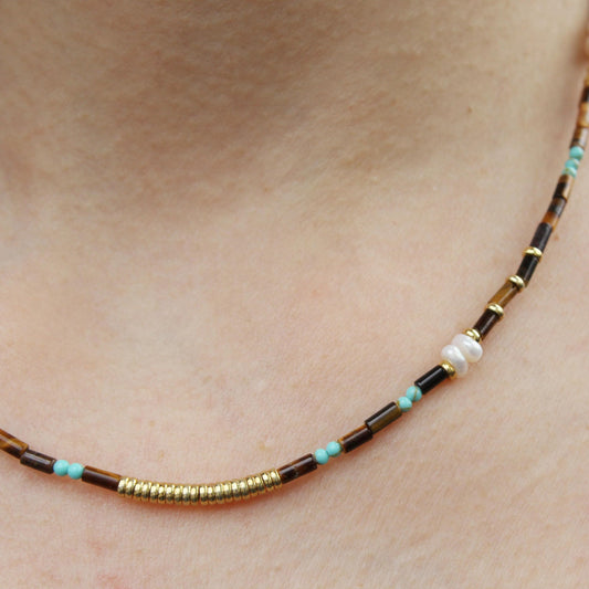 Tiger Eye, Pearl and Turquoise Beaded Necklace | Boho Minimalist Gemstone Choker | Handmade Natural Crystal Jewelry | Gift for Her