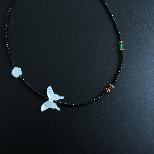 White Butterfly Shell Necklace with Black Fine Crystal, Natural Gemstone Jewelry, Choker, Beaded Necklace