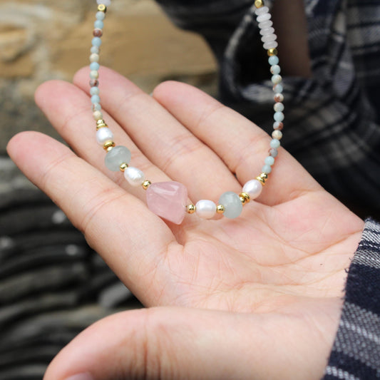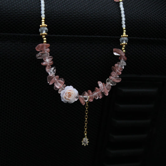 Rose Quartz Chip Necklace with Flower Pendant | Romantic Fairycore Jewelry | Handmade Boho Crystal Choker | Gift for Her | Sweet Style
