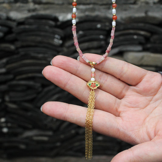 Red Jasper Necklace with Pearl & Carnelian | Handmade Boho Tassel Necklace | Vintage Floral Pendant | Healing Stone Jewelry for Women
